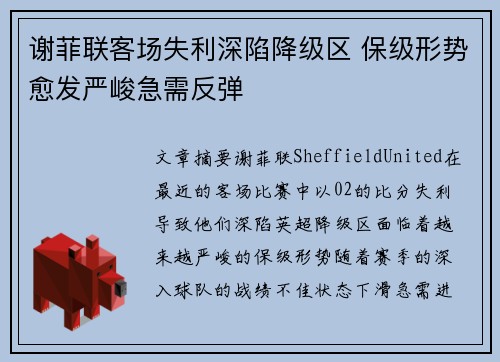 文章摘要:谢菲联(Sheffield United)在最近的客场比赛中以0-2的比分失利,导致他们深陷英超降级区,面临着越来越严峻的保级形势。随着赛季的深入,球队的战绩不佳,状态下滑,急需进行反弹以摆脱降级的困境。本篇文章将从四个方面深入分析谢菲联的现状,包括球队近期表现、战术调整不足、核心球员状态低迷以及保级形势的愈发严峻,最后提出可能的解决方案。文章通过对这些方面的细致分析,旨在揭示谢菲联面临的挑战与困境,并探讨球队如何调整和应对接下来的赛季压力。
