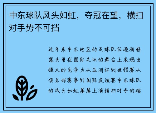 近年来,中东地区的足球队伍逐渐崭露头角,在国际足坛的舞台上表现出强大的竞争力。从亚洲杯到世预赛,从俱乐部赛事到国际友谊赛,中东球队的风头如虹,屡屡上演横扫对手的精彩场面。随着实力的不断提升,这些球队的夺冠梦想也愈加近在眼前。本文将从多个方面详细分析中东球队为何能够在国际赛场上风头劲盛,为什么他们的夺冠之路势不可挡。